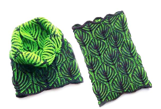 В описании рассмотрено, как вязать снуд в технике бриошь для двух комбинаций цветов пряжи: зелено-черной и розово – сиреневой.