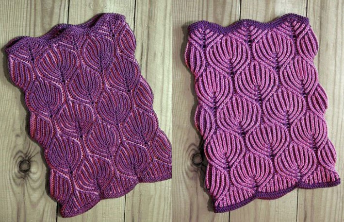 К этому этапу уже хорошо просматривается схема узора спицами в технике бриошь: первая часть раппорта показывает сворачивающийся лист, вторая – разворачивающийся. Дальнейшее вязание будет давать зеркальный вариант рисунка: