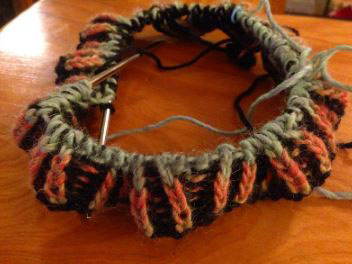 Набираем черными нитками 120 пет., устанавливаем маркер и переходим на круговое вязание. Провязываем 1р. лиц/п, отводим нить за полотно и след-щий р. вяжем цветными нитками. Этот рядок будет установочный: * снимаем 1 птл как изн/п, нитка впереди полотна, 1н., 1 изн/п*. От * и до * повторяем вкруговую.