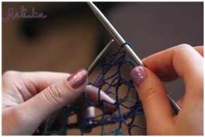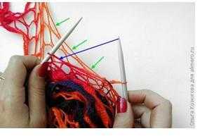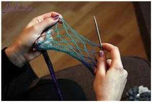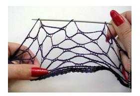 Держим сеточку левой рукой, а правой рукой возьмем спицу, одновременно придерживая пряжу со второй стороны. Затем нанизываем на нее верхние петли сеточки, не оставляя ни одной, и не делая пропусков: