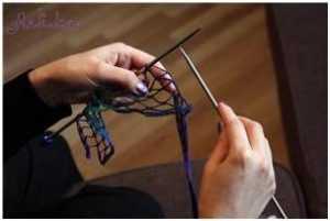 Всегда придерживайте ячейки ленты пальцами, чтобы легче было вязать и считать петли шарфа. Выполняя рукоделие, вы должны просто вязать из верхней нити лицевыми петлями. Отметим ту особенность, что в данном вязании отсутствуют кромочные петли. Необходимо постоянно расправлять руками ленту, и располагать ее сзади левого инструмента в начале вязания любого из рядов шарфика.