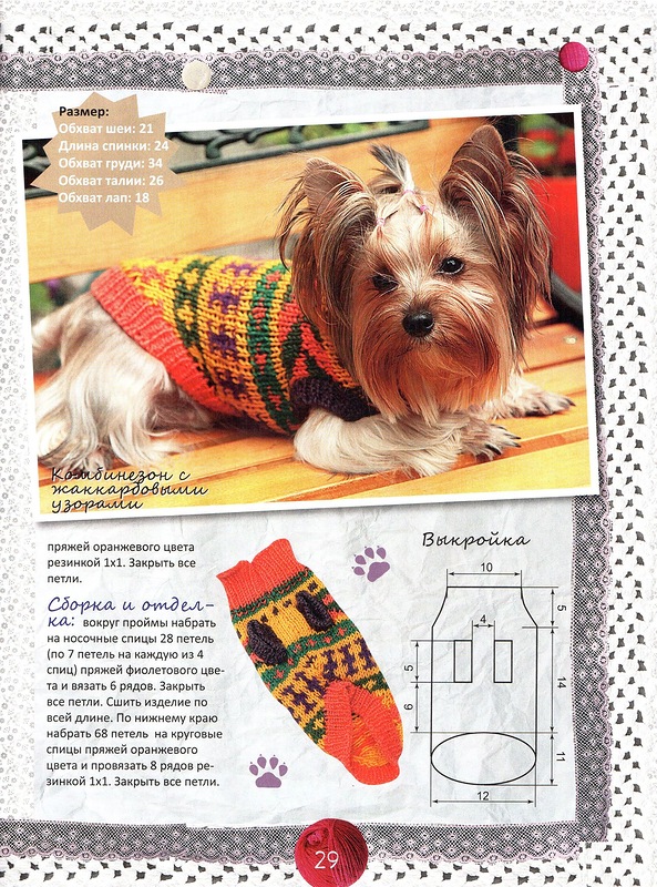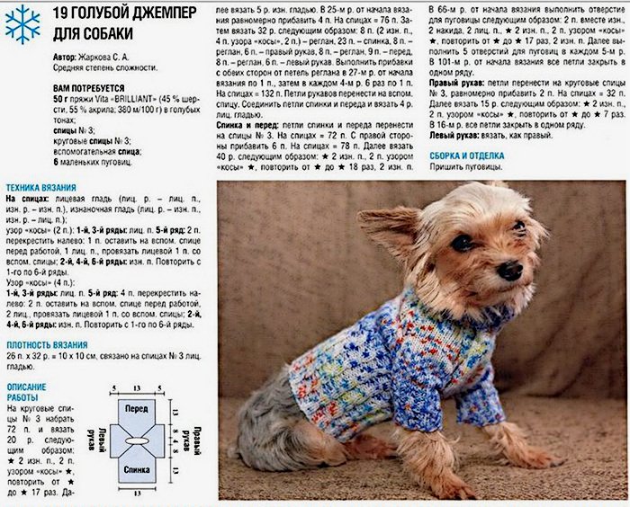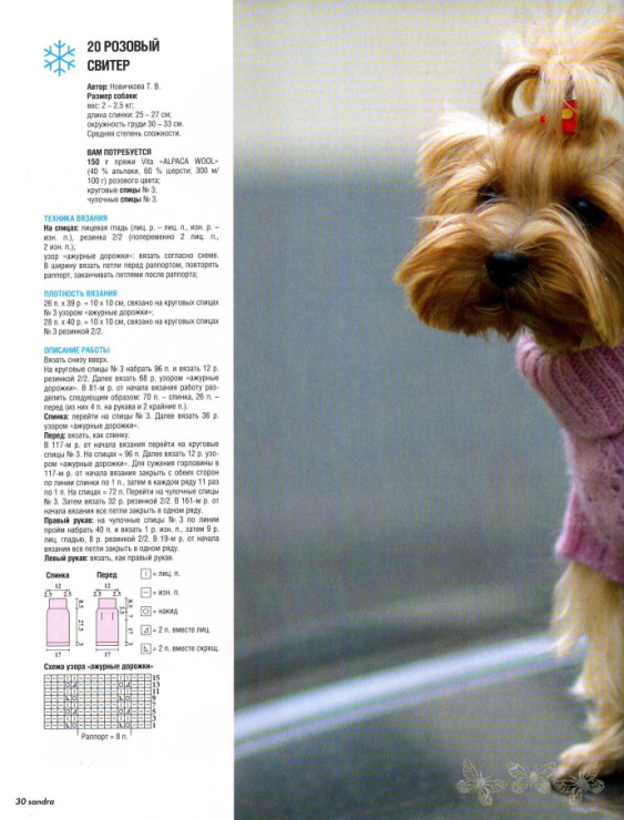 С 36р. (19см) с обеих сторон делаем убавление по 1п., как описано для спинки. Повторяем убавку через рядок. Остается 22п., на которых вяжем ровным полотном. С 58р. (30см) спицами No5 свитер для собаки вяжем рез-кой. Провязываем 16р.(8см) и закр. п.