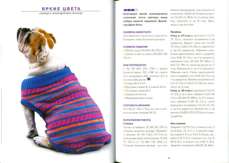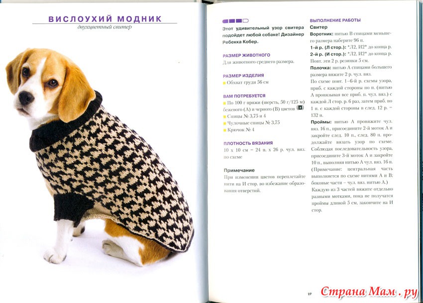 Затем 18п. со стороны переда закр. Остальные – вяжем прямыми/обратными рядами еще на 10см. Затем все п. закр. Край свитера для собаки обвязываем крючком столбиками без накида.