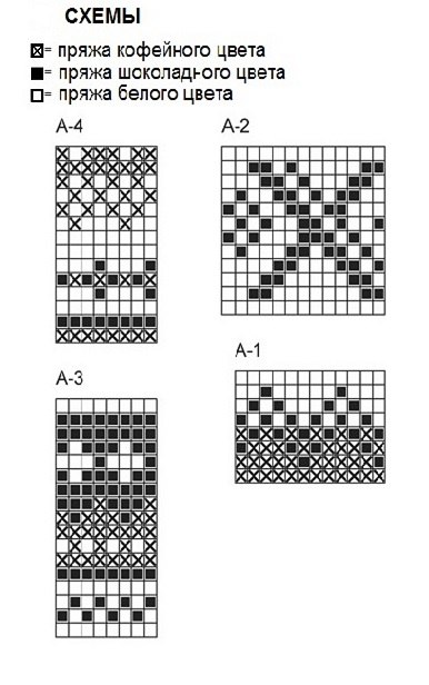 - ч/ш пряжа (50г на 100м), кофейного цвета – 50; 100; 150; 200г; *такая же, белого цвета – 50; 50; 100; 100г; *такая же, шоколадного цвета – 50; 50; 50; 100г; *набор носочных спиц No3,5 – для р-ра XS; *набор носочных спиц No3;