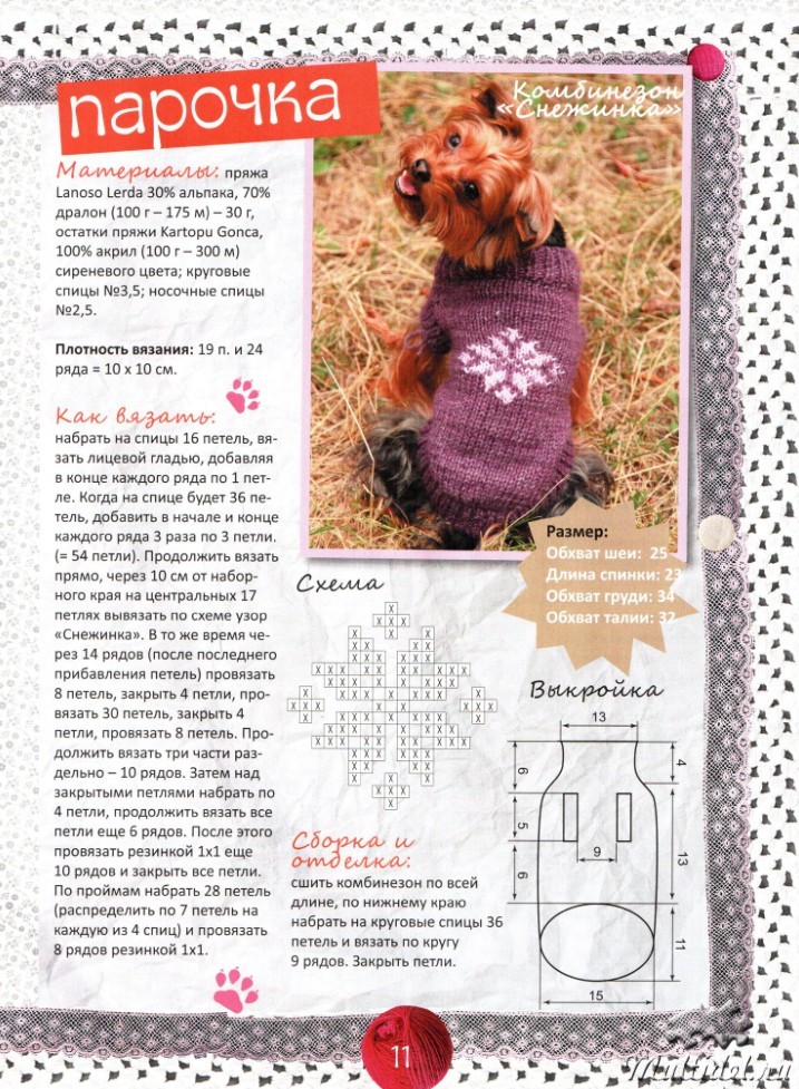 С приходом холодов вязаная одежда для собачек становится очень востребованной. Позволяя обеспечить комфорт и тепло питомцу во время прогулок, свитера, шапочки, ботиночки служат украшением для собачки и предметом гордости для хозяина. Особенно, если вязаный свитер для собаки спицами выполнен собственными руками. Предлагаем вам позаботится о своих питомцах и связать теплый, уютный и красивый свитерок.