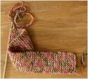 Такая техника вязания тапочек спицами не предполагает предварительной обвязки войлочной подошвы, но необходимо будет пробить шилом соответствующие отверстия. Для рукоделия потребуются меланжевая рыхлая пряжа и спицы № 5. Чтобы связать тапочки размером от 34 до 39, набирайте спицами 12 петель (П). Данное количество соответствует определенной глубине тапочка. Тем из вас, кто хочет связать более глубокую домашнюю обувь, количество П необходимо будет увеличить. Набрав нужные петли, вяжем полосу по прямой линии, не выполняя убавлений и прибавлений петель:
