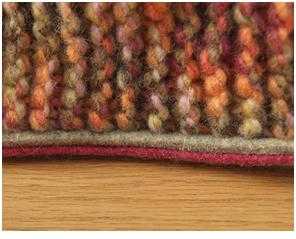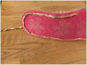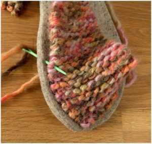 В процессе вязания полосы делаем внимательный подсчет количества связанных рядов. Оно должно в два раза превышать то количество отверстий, которое вы уже пробили в войлоке. Если вы прокололи по 70 дырочек, значит нужно связать спицами 140 рядов. Довязав последний ряд, обрезайте нитку, оставив при этом длинный хвостик, около 1 метра. Он понадобится вам, чтобы пришить полотно к подошве. Чтобы собрать готовый тапок, необходимо начать с мыска, соединяя его нитью с первой войлочной подошвой. На одну дырочку приходится по одному рубцу узора. Это простая операция, которая не требует большой аккуратности. Все дело в том, что первый шов будет замаскирован, когда вы пришьете вторую часть подошвы: