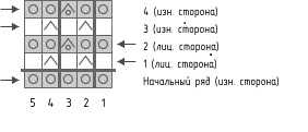 - Квадрат со стрелкой и кружочком, означает ИП из нижнего Р на лицевой стороне, и ЛП из нижнего Р на изнаночной стороне.