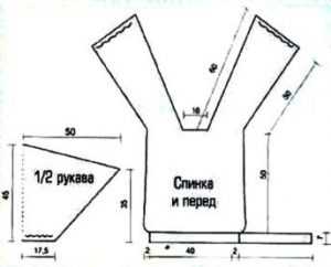 - На спицах остаются 65 П. Выполняем вязание на длину в 50 см, после чего закрываем 25 П в центре полотна, формируя при этом горловину спинки, а также две отдельные детали.
