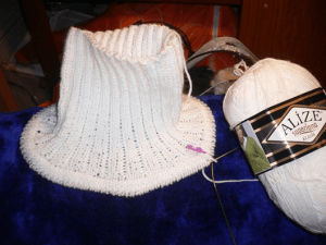 Когда полотно доведено до 50 см в плечах, а также 30 см от угла до горловины, закрываем все петли. Вязание спинки выполняется по тому же принципу. Единственное различие состоит в том, что закрытие П горловины выполняется на высоте в 28 см. Закрываем для нее 20 петель. В конце обе половины сшиваются, а по краям набирается 48 петель. Из них нужно связать 2 Р платочной вязкой. При этом надо одновременно увеличить число до 52 единиц. Затем выполним 14 см резинкой 3х3 круговыми инструментами. Закончив резинку, закрываем все П последнего ряда, не затягивая их.