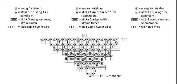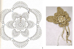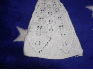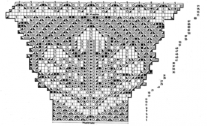 Схема ажура содержит только лицевые Р, при этом изнаночные выполняются по узору. Для этого круговое вязание предполагает выполнение ЛП над лицевыми и ИП над изнаночными звеньями. Для наглядности мы изготовили небольшой образец с двумя раппортами прилагаемой схемы: