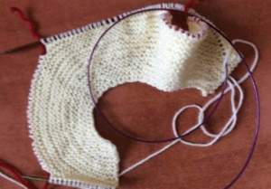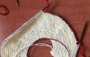 - На круговые спицы №2 набираем 56 п. и вяжем 3 р. платочной вязкой.