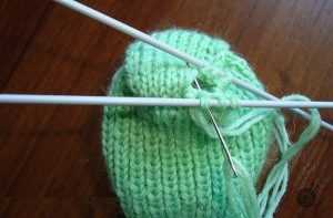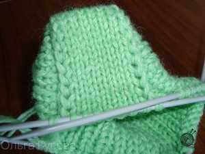 - Вязание должно дойти до пятки, где должны сойтись две половинки одного целого, берем иголку и нитку и соединяем их петля в петлю.
