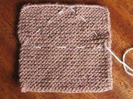 Связав квадрат, большим сметочным стежком сделайте прошивку по центру полотна (для этого вязание сгибают вдвое). Кончик оставьте без узла.