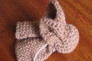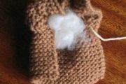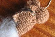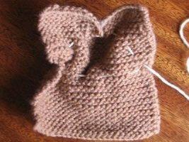 Далее вяжем спицами кролику ушки. Наберите для этого три п. Все дальнейшие ряды – лицевые. С первого по третий рр. – лиц. В четвертом: прибавление (2 лиц из 1 п. за переднюю и заднюю стеночки), 1 лиц., прибавление. Пятый р. – лиц. Шестой р. – убавление (две п. совместно), 1 лиц., убавление (= три п.). Седьмой р. – лиц.