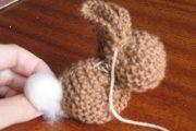 Одной из последних деталей для кролика к Пасхальной неделе вяжутся лапки (четыре шт.). Данные элементы представляют собой своего рода шнурки, состоящие из трех рядочков. Наберите 3 п. и провяжите их лицевыми. Затем, вязание не переворачивается, а петельки отодвигаются с левого края спицы на правый. Здесь захватите петлицу с края правой стороны, рабочая нитка при этом будет с левой и провяжите по очереди все три звена. Дальше петельки следует закруглить для формирования небольшого шнурочка. Таким образом, провяжите 3 рядочка, стяните 3 п. иголкой и у сам получится одна из лапок кролика. Нитку спрячьте в процесс.