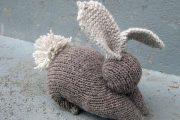 Этот вариант представляет собой более простой пример вязания, с которым без труда справится даже начинающая рукодельница. Для создания этого кролика к Пасхальной неделе, приготовьте пряжу основного оттенка, контрастные нити, большую иголку с крупным отверстием, пару пуговиц.