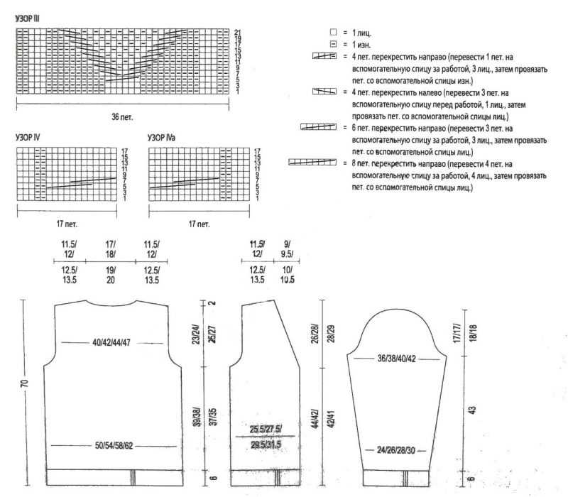- Через 6 см – изн. ряд убирая 7 (S) и +2 для каждого последующего. Дальше распределяем узоры: II и III в таком же количестве как начало спинки, 17 – IV и от 0 до 3 изнаночных в зависимости от размера.