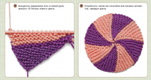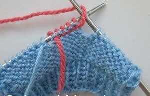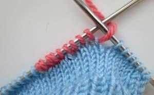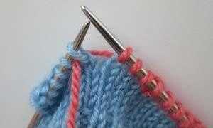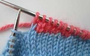 Первый способ частичного вязания – это выполнение накидов, для удобства короткие ряды вяжутся нитью другого цвета.