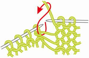 В следующем ряду при провязывании накида захватывается следующая после него петля и из них выполняется один узелок. Таким образом закрывается дырочка на полотне из-за незаконченного ряда.