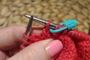 На первой и второй СП поставим маркер после 13ой петли. 21 Р – на первой СП после маркера провяжем две П вместе за заднюю стенку. На второй СП перед маркером вяжем две П вместе за переднюю стенку. На третьей СП вяжем вместе 12, 13 и 14 петли, так, чтобы средняя была по центру. Для этого снимем первую и вторую П на правую СП зацепив их за переднюю стенку, а теперь вернем перекрученными обратно. Провяжем три П за заднюю стенку.