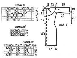 Изделие следует вязать сверху. Наберите спицами петли и выполните платочную вязку прямыми рядами. Затем обратите внимание на предложенную схему узора «уголки». На ней изображены только лиц. р., а изнаночные вяжутся согласно рисунка. Завершив этот раппорт узора, соедините ряды и продолжайте вывязывать по кругу по такой схеме: три полосы платочной вязкой, десять рядов по рис. 5а и столько же рядов по рис. 5б. После этого формируйте линию реглана, сделав распределение звеньев по выкройке. На представленном видео будет показан подробный процесс того, как вяжется ажурная кокетка для платья.
