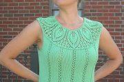 Благодаря вязанию круглой кокетки с ажуром, даже самое простое платье, сделанное лицевой гладью, будет смотреться намного выигрышнее с таким верхом. Такой пример прекрасно подойдет не только для платья, но и для топа и туники.