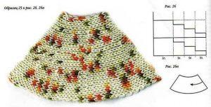 Первая схема демонстрирует, как связать спицами круглую кокетку снизу. В каждом 4 р. нужно выполнить равномерные уменьшения петлиц. С помощью совместного провязывания двух петелек, ваше полотно будет постепенно приобретать закругленную форму.