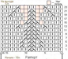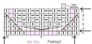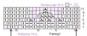 Сначала снимаем кромочную П, далее две лицевых петли (ЛП), в результате чего получим две ЛП вместе. Затем идут три ЛП, 1накид, одна ЛП, 1накид, три лицевые, и три П вместе лицевой с перестановкой. Для перестановки правую спицу введем впереди полотна в П номер два, и одновременно снимем ее вместе с предыдущей со спицы, придерживая первую рукой. Затем левая спица сзади полотна подхватывает первую петлю, и П с правой спицы добавляется туда же. Остается выполнить три П вместе как лицевые. Далее заканчиваем первый Р в зеркальном отражении по схеме. Следующий изнаночный Р вяжется по рисунку. Продолжаем работу по той схеме, которая имеется на видео, и является чрезвычайно наглядной, в чем вы сами убедитесь. Раппорт узора по горизонтали составляет десять П, и по вертикали восемь рядов. Когда вы довязали, то надо несколько растянуть низ, но только за самый край, то есть ряд набора. Обратите внимание, что эта техника выполнения каймы обеспечивает ее достаточную длину, чтобы не стягивать край полотна. Прием выполнения первых двух рядов ИП не дает краю полотна заворачиваться, что очень ценно.