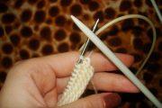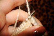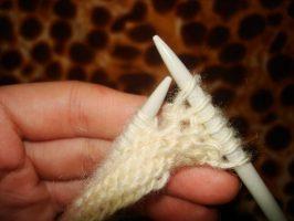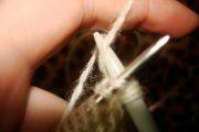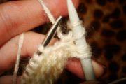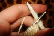 Потом нужно после кромочной петли каждую последующую провязывать, набирая одновременно две. Для этого нужно просунуть спицу в петлю, дважды обернуть рабочую нить вокруг рабочей спицы и вынуть получившееся обратно. Вязание шарфа спицами в этом моменте должно уже начинаться широким инструментом.