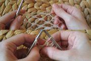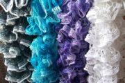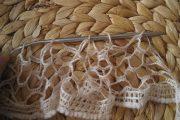 Следующие ряды вяжем как первый, через одну ячейку. Продолжаем вязание до желаемой длины, но, как правило, из одного целого мотка получается шарф идеальной длины. Подходя к концу, а точнее, на предпоследнем ряду, не забудьте снова ввязать бусины. Закрываем шарф также, как при работе с обычными нитками. А в конце завяжем крепкий узел, его не будет видно за воланами. Этот мастер-класс представлен Екатериной Курылевой.