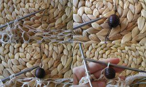 Отступаем одну ячейку, и продеваем в следующую, подготовленную нить. Концы пропускаем через бусину (если бы нить не была проклеена, то вдеть ее в бусину было гораздо сложнее). Теперь протягиваем ячейку через отверстие, а получившуюся петлю пропускаем через первую петлю на левой спице, как при вязании обычной лицевой петли. Вторую, и последующие бусины будем вводить через две петли таким же образом. Вот так выглядит второй ряд.