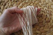Вот так выглядит первый провязанный ряд. Воланы сами, без лишних усилий с нашей стороны, будут красиво накладываться друг на друга, ряд за рядом. В следующем ряду будем добавлять бусины. А вот тут нам понадобится нитка, которую мы проклеили лаком для ногтей. Она, наверняка, уже высохла.
