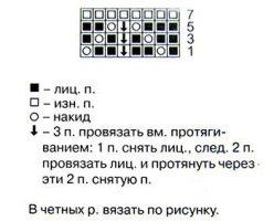 Наберите сто сорок шесть петелек и вяжите узор по указанной схеме. Высоту вяжут с первой по тридцать четвертую полосу, а потом повторяют с 27 р. по 34 р. Чередование делайте так, как указано на рисунке. Когда высота изделия будет семнадцать сантиметров от кромки, делайте уменьшения звеньев по десять штук в каждом втором ряду. Достигнув высоты 23 см, провяжите от начала линии и до конца по две совместные петельки. Те звенья, которые остались на спице, стяните в пучок. Заключительный шов выполняется на затылке. Ни одни зимние вещи не могут обойтись без такой замечательной детской шапки.
