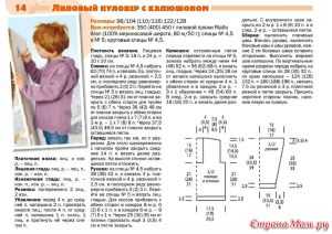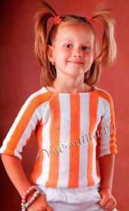 Этот пуловер подойдет на девочку от 3 до 6 лет. Для работы потребуется смешанные нитки, хлопок с акрилом, 160 м/50 гр, 100 граммов апельсинового, и 50 граммов белого цвета. Кроме того, приготовьте спицы № 2,5.