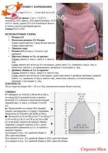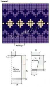 - Затем переходим на выполнение спицами узора схемы 1. Данная схема содержит все указания по убавлению спицами петель горловины.