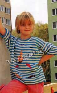 Такая тельняшка с веселыми вышитыми картинками на морскую тему понравится каждой маленькой девочке. Он подойдет на рост 134 см. Потребуется 150 г белой и голубой пряжи, и