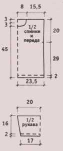- Передняя полочка вяжется аналогично спинке, но на высоте 45 см закрываются центральные 19 П. Затем каждая часть переда выполняется отдельно.