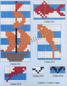 - Чтобы собрать пуловер для девочки, надо вышить рисунки корабля, птиц и рыбок по следующим схемам.