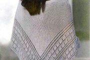 Следующий вариант платка подойдет для молодой девушки к празднику Благовещение. Его вяжут сразу несколькими ажурными орнаментами. Размер изделия составляет 85 см на 185 см. Вам нужно приготовить пряжу из мериносовой шерсти и натурального шелка сиреневого цвета. Также понадобятся круговые спицы под номером № 3,5. Вязаная плотность полотна 23 п. на 39 р. = 10 на 10 см.