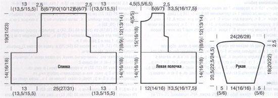 Ориентировочная плотность вязания: 23 п. х 31 р. = 10 х 10 см спицами № 3,5.