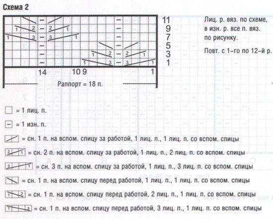 - 2 р.: 1 л. п., 1 и. п., 1 л. п., 1 и. п., 1 л. п., 4 (5, 6) и. п., 1 л. п., 4 и. п., 3 л. п., (снимаем след. п. на вспомогат. сп. и оставляем перед работой, след. п. провязываем изнаночн., далее пет. со вспомогат. сп. провязываем лицев.), (снимаем след. п. на вспомогат. сп. и оставляем позади вязания, след. п. провязываем лицев., далее пет. со вспомогат. сп. провязываем изнаночн.), 4 л. п., (снимаем след. п. на вспомогат. сп. и оставляем перед работой, след. п. провязыв. изнаночн., далее пет. со вспомогат. сп. провязываем лицев.), (снимаем след. п. на вспомогат. сп. и оставляем за работой, след. п. вяжем лицев., далее п. со вспомогат. сп. вывязываем изнаночн.), 3 л. п., 4 и. п., 1 л. п., 10 (11, 12) и. п.