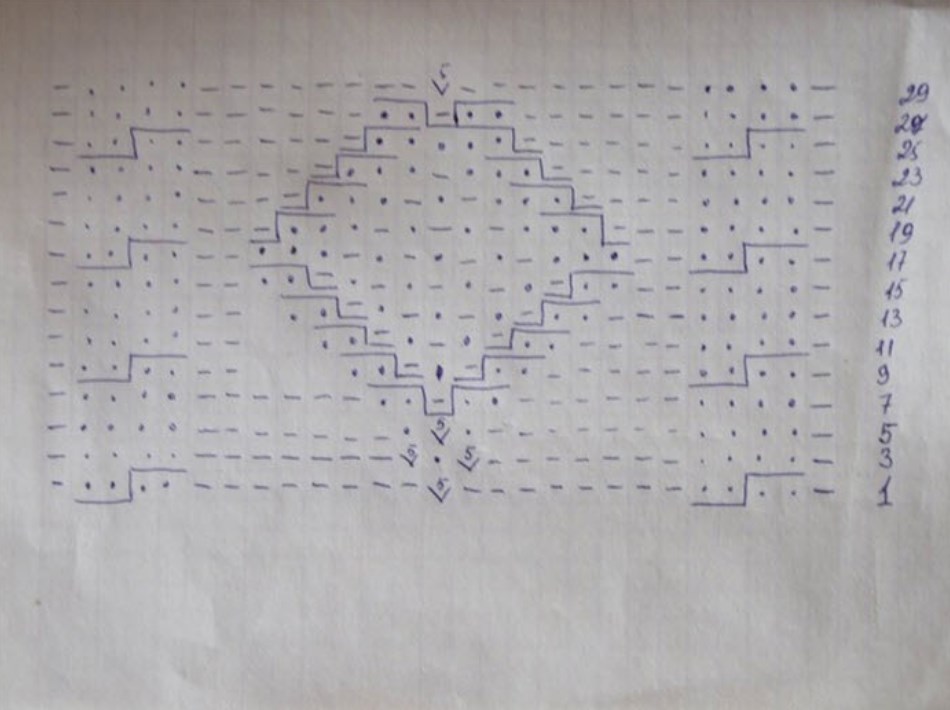 - 5 р.: 1 (3, 2) л. п., 1 л. п., 6 и. п., *с2ф, 6 и. п.*, от * до * до последн. 2 (4, 3) п., 2 (4, 3) л. п.