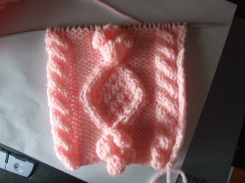 Сейчас провязываем косичку (три раппорта). В крайнем изнан. р. выполняем убавки – вяжем 4 и 5 п. вместе изнаночн. п. После этого вяжем плетенку на 4 рапп., а далее – медальоны. С началом провязывания медальонов, выполняем убавки для проймочек: 1 х 4 п., 4 х 2 п. в кажд. 2-м р. (всего – 12 п.). Вяжем 2 рапп. медальонами, после чего делаем 4 р. платочным вязанием, далее – вяжем рисом.