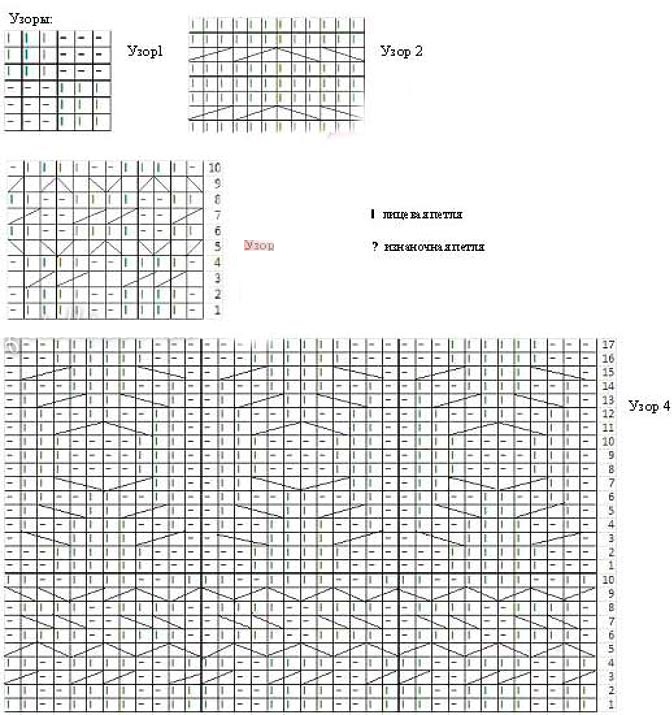 - 4 р.: 1 л. п., 1 и. п., 1 л. п., 1 и. п., 1 л. п., 4 (5, 6) и. п., 1 л. п., 4 и. п., 1 л. п., (сн. сл. п. на всп. сп. впереди, сл. п. вяж. изнан., п. со всп. сп. вяж. диц.), 4 л. п., (сн. сл. п. на всп. сп. позади, сл. п. вяж. лиц., п. со всп. сп. вяж. изн.), (сн. сл. п. на всп. сп. перед работой, сл. п. вяж. изн., п. со всп. сп. вяж. лиц.), 4 л. п., (сн. сл. п. позади, сл. п. вяж. лиц., п. со всп. сп. вяж. изн.), 1 л. п., 4 и. п., 1 л. п., 10 (11, 12) и. п.
