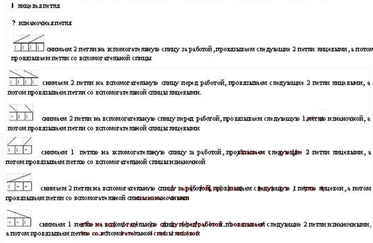 - 3 р.: 10 (11, 12) л. п., 1 и. п., 4 л. п., 2 и. п., (снимаем сл. п. на всп. сп. позади вязания, сл. п. провяз. лицев., далее п. со всп. сп. провяз. изнан.), 2 и. п., (сн. след. п. на всп. сп. перед работой, сл. п. провяз. изнан., далее п. со всп. сп. вяжем лицев.), 2 и. п., (сн. след. п. на всп. сп. за работой, сл. п. вяж. лицев., п. со всп. сп. вяж. изнан.), 2 и. п., (сн. сл. п. на всп. сп. впереди работы, сл. п. вяж. как изн., п. со всп. вывязываем лиц.), 2 и. п., 4 л. п., 1 и. п., 4 (5, 6) л. п., 1 л. п., 1 и. п., 1 л. п., 1 и. п., 1 л. п.