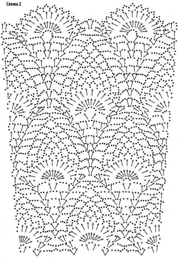 Набираем крючком 76 в. п. и вяжем согласно схемы 1 до уровня 9 см, где выполняем убавки для проймочек по обе стороны вязания (по 2,5 раппорта).