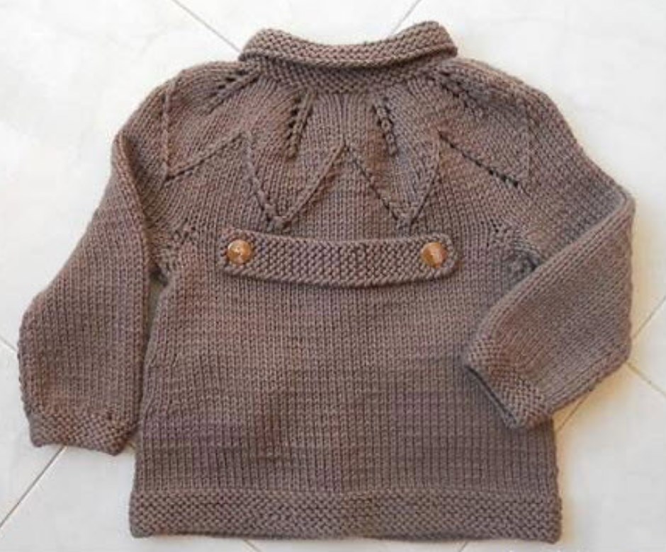 Планочка левой полки вяжется точно так же, но с петельками под пуговки. Во втором ряду, начиная от разреза горловины, вяжем: 1 кромочн., 3 п. в узор, закрываем 2 п., *8 (10, 13) п. в узор, закрываем 2 п.*, повторяем 1 х *-*, все остальные п. вяжем по узору. В следующем рояду набираем по 2 п. над каждой закрытой. Связав 5 р., закрываем все петли и пришиваем пуговички.