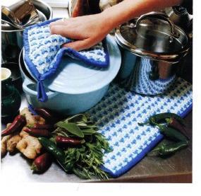 Эти кухонные аксессуары для международного женского дня, будут вязаться в технике снятых петелек. Вязание выполняется по прямой. Вам может показаться, что такая техника очень сложная, но это совсем не так. В процессе работы вы сможете в этом убедиться. Размер прихватки и коврика 20 на 20 см и 41 на 30 см соответственно. Для работы приобретите пряжу из ста процентного хлопка трех разных цветов. Темно-синий оттенок нити будет обозначаться буквой «А», голубой буквой «Б», а белый – В. Спицы используйте под номером № 4. Еще понадобится дополнительный материал представленный в виде мольтоновой ткани из синтетики средней толщины, а хлопковой ткани и нитки подходящей по тону.