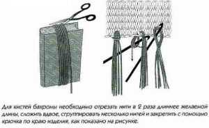 Для бахромы отрезаем нити, длина которых равна 25 см. Складываем по 2 нити вместе, и потом сложим их вдвое. Теперь возьмем вязальный крючок, и через петельку крайнего ряда захватываем двойную петлю на нитке, продевая ее внутрь. Затем заводим кончики в эту П, и затягиваем их в узел. Из пряжи коричневого цвета надо сделать 54 кисточки, и прикрепить их узелками по длинной стороне коричневого шарфа. Для серого изготовим 20 кисточек, и добавим их на обе короткие стороны, по 10 штук на каждую.